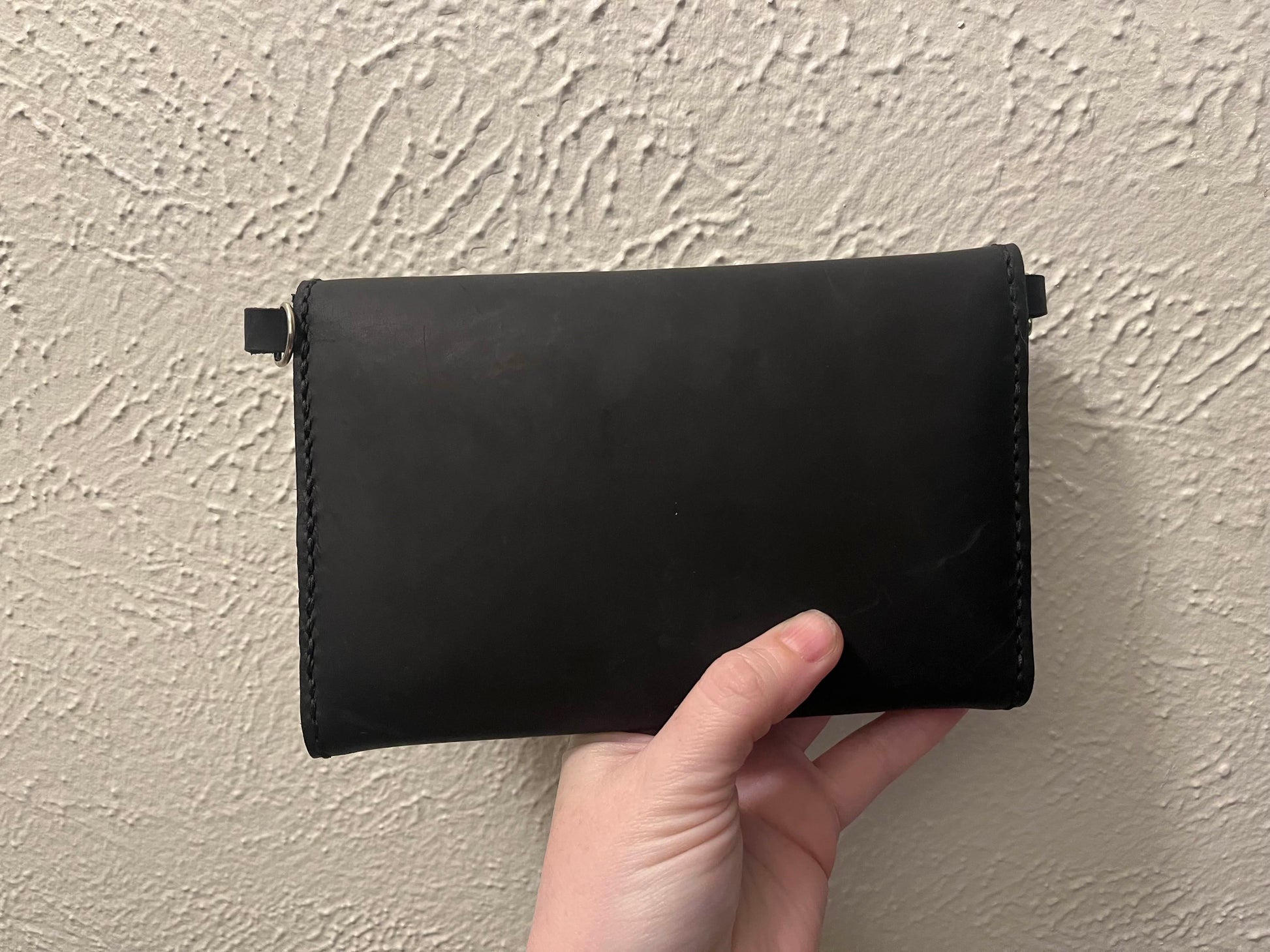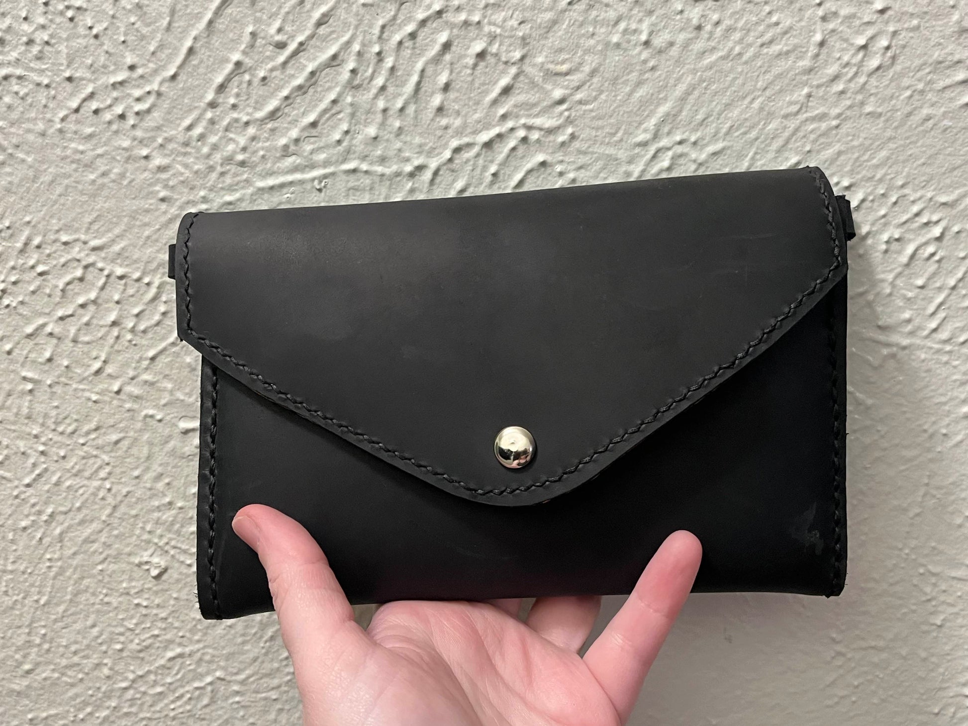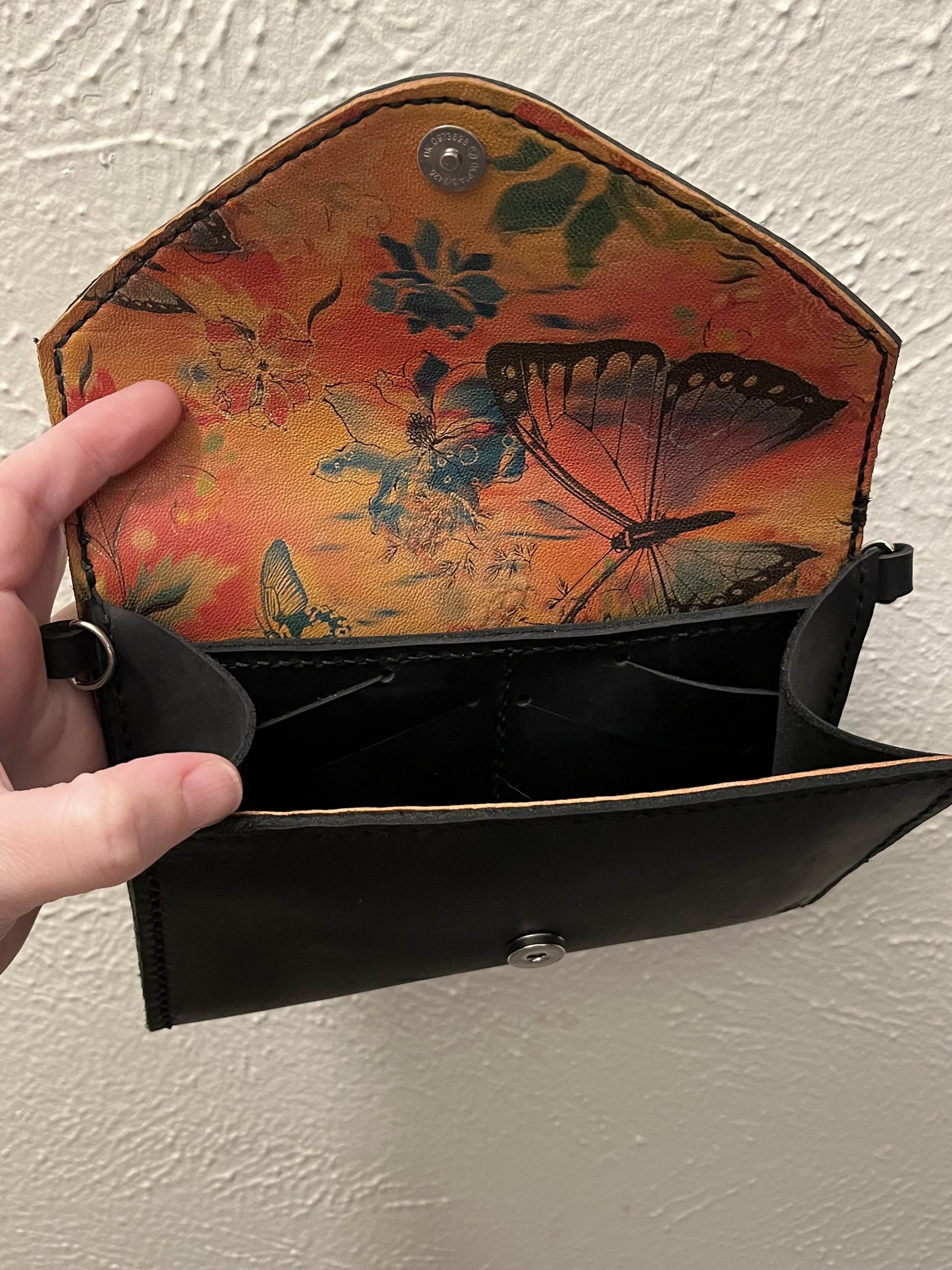 The Shadowveil Clutch speaks to those who find beauty in shadow. Crafted from smooth, matte black leather and hand-stitched with precision, its unassuming exterior conceals a vivid butterfly lining- a hidden spark of life and transformation